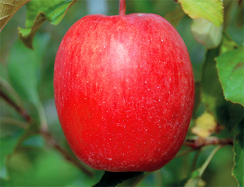 りんご300g位と大きく長円形で、黄緑地に全面鮮紅〜濃紅色に着色す...