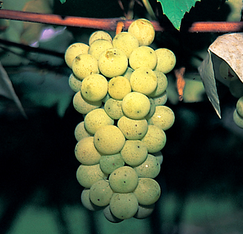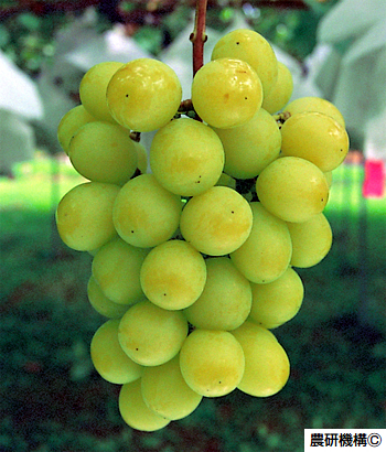 ぶどう緑黄色の果粒は円形大、果房円錐形で400g位。果皮が黄色く、...