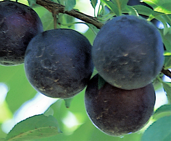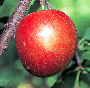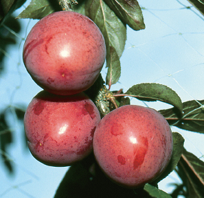スモモ果形は円形で、果皮は濃赤色で果肉は赤い。果実はレイトソルダム...