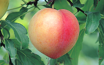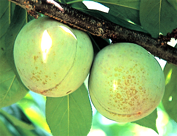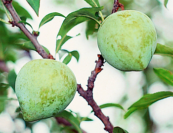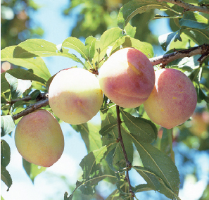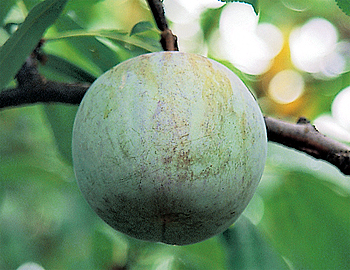 スモモ果実はふっくらとした卵形。果皮は白黄地に先端より桃色から牡丹...