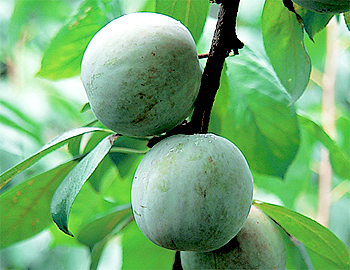 スモモ200g位で果皮は緑黄色で心臓形、果頂部は少しとがっている。...